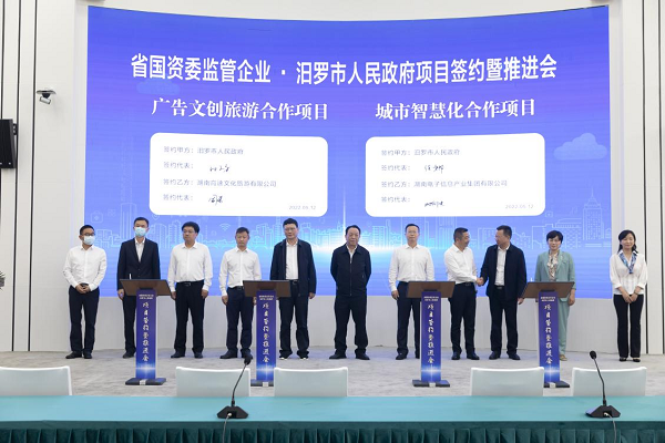 为扎实推进汨罗市与省属国企在乡村振兴和经济社会发展等领域的广泛合作,近日,在省国资委监管企业与汨罗市人民政府项目签约暨推进会上,湘投集团所属湖南电子信息产业集团有限公司(简称“信产集团”)与汨罗市人民政府签署战略合作协议。省国资委党委委员、副主任、一级巡视员张美诚,岳阳市副市长陈阁辉出席签约仪式并讲话。集团党委委员、副总经理周灵方与汨罗市政府有关领导见证签约。