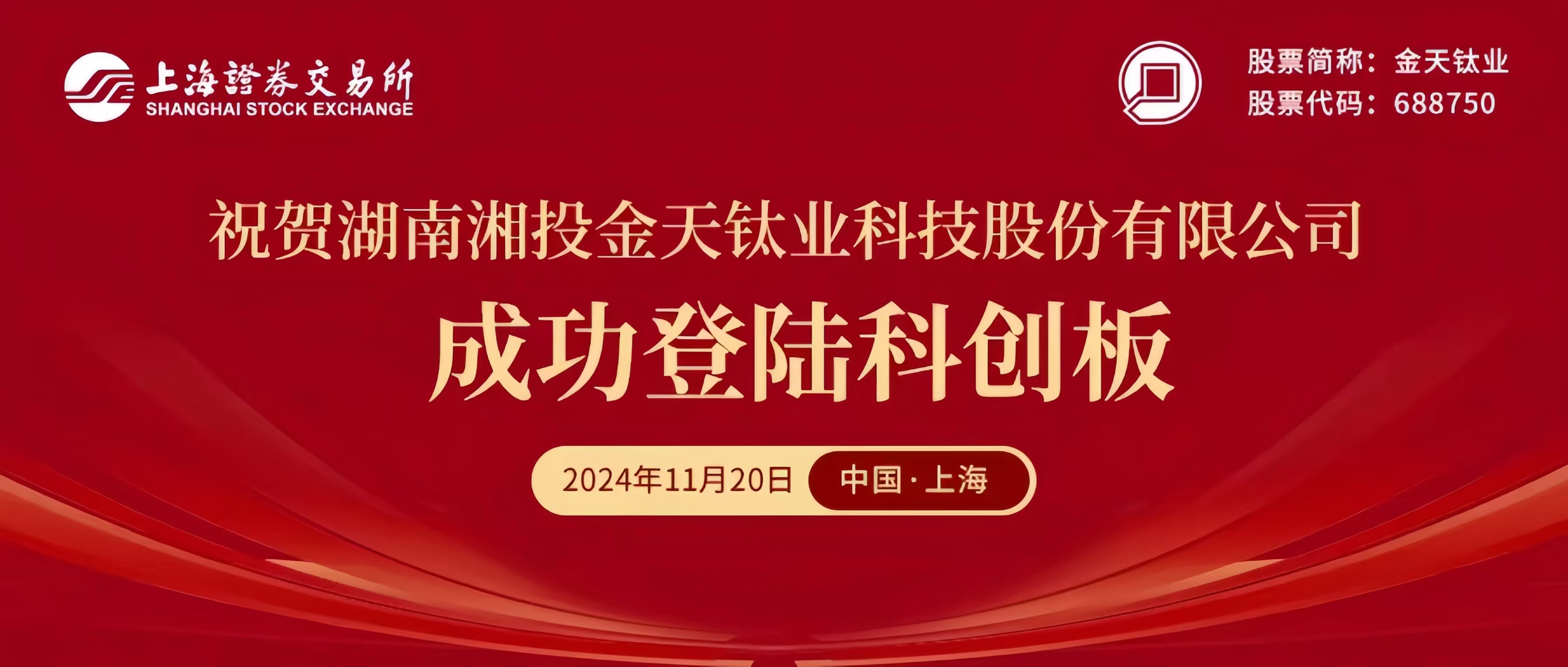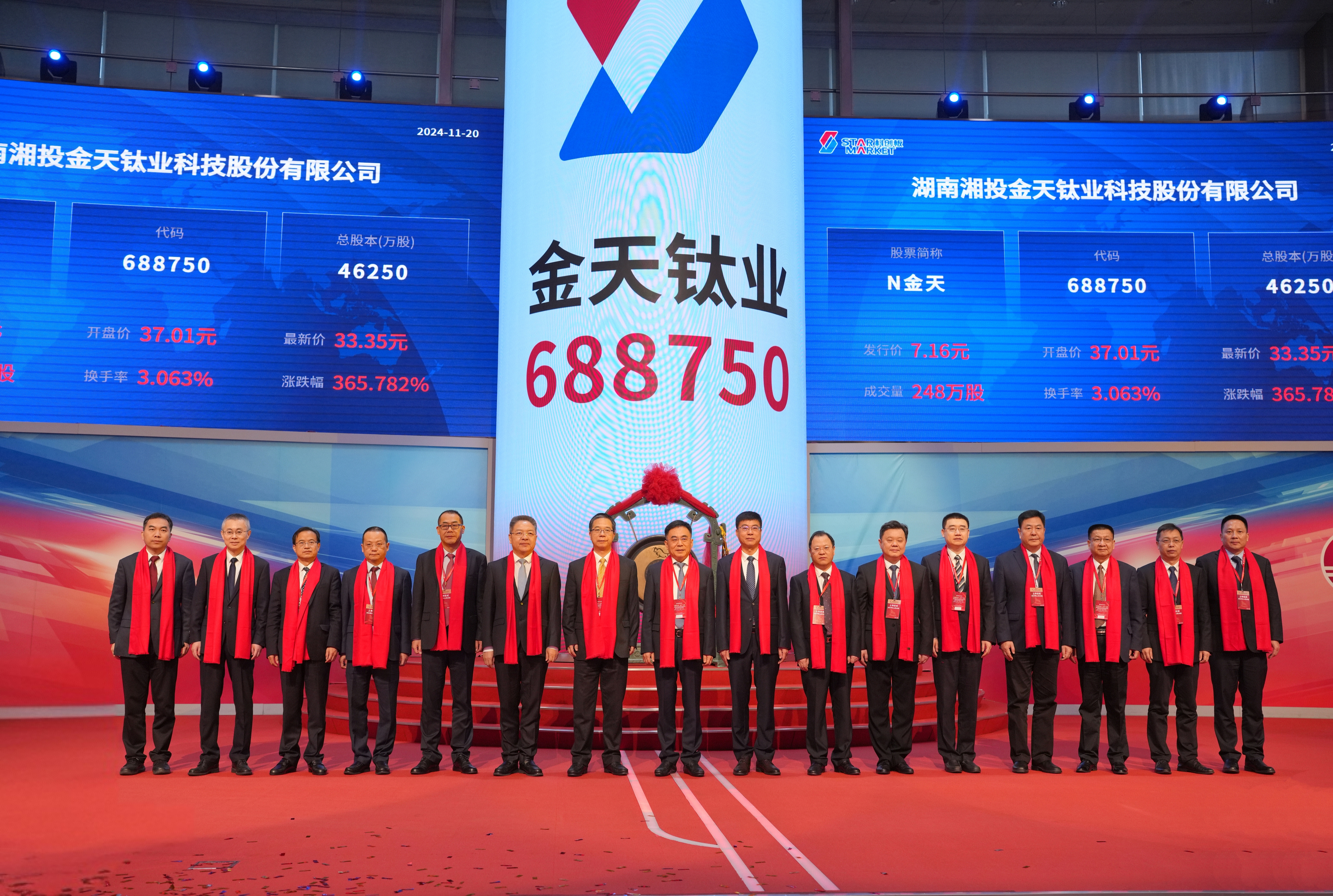 11月20日,湖南省能源投资集团有限公司(简称“湖南能源集团”)所属企业湖南湘投金天钛业科技股份有限公司(简称 “金天钛业”)在上海证券交易所鸣锣上市,成为2024年湖南首个在A股正式登场亮相的企业。股票代码为688750.SH,发行价格7.16元/股,开盘价37.01元/股,开盘大涨416%。