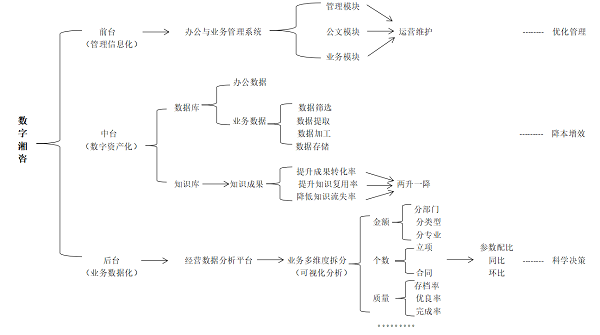 目前,省咨询公司已初步形成以办公和业务管理系统为前台依托、知识库平台为中台支撑、经营数据分析平台为后台驱动的“三驾马车”数字化运营模式,信息化建设成效显著。下一步,公司将围绕“管理信息化—数据资产化—业务数字化”转型路线,打造“数字湘咨”品牌,不断促进优化管理、降本增效、科学决策,助力集团公司高质量跨越式发展,为“数字湖南”建设贡献力量。