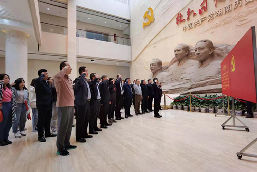 在湖南党史陈列馆前厅,邓军民带领党员干部职工重温入党誓词,大家高举右手,再次庄严宣誓,砥砺初心使命。
