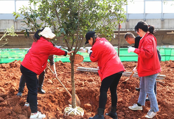 活动现场热火朝天,大家发扬团结协作、吃苦耐劳的优良作风,挥锹铲土,逐步完成栽树、扶苗、培土、浇水等一道道工序,同心协力种下树苗。一颗颗“新绿”迎风挺立在山坳上,与一抹抹“管网红”交相辉映,在明媚的阳光下焕发出勃勃生机。