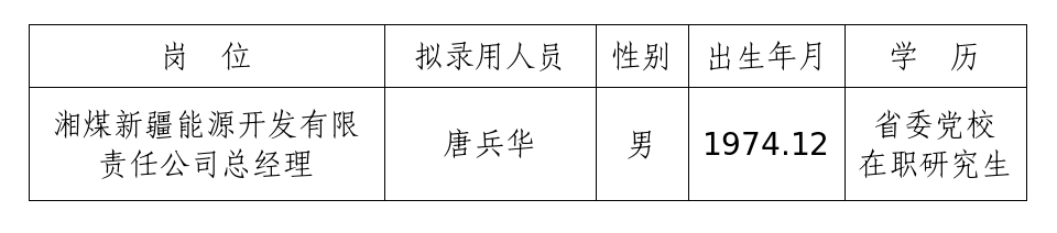 根据《湖南能源集团全资子公司湘煤新疆能源开发有限责任公司总经理公开招聘公告》,经报名、资格审查、面试、背景考察、体检、集体研究决策等程序,确定唐兵华同志为拟录用人员,现予以公示。