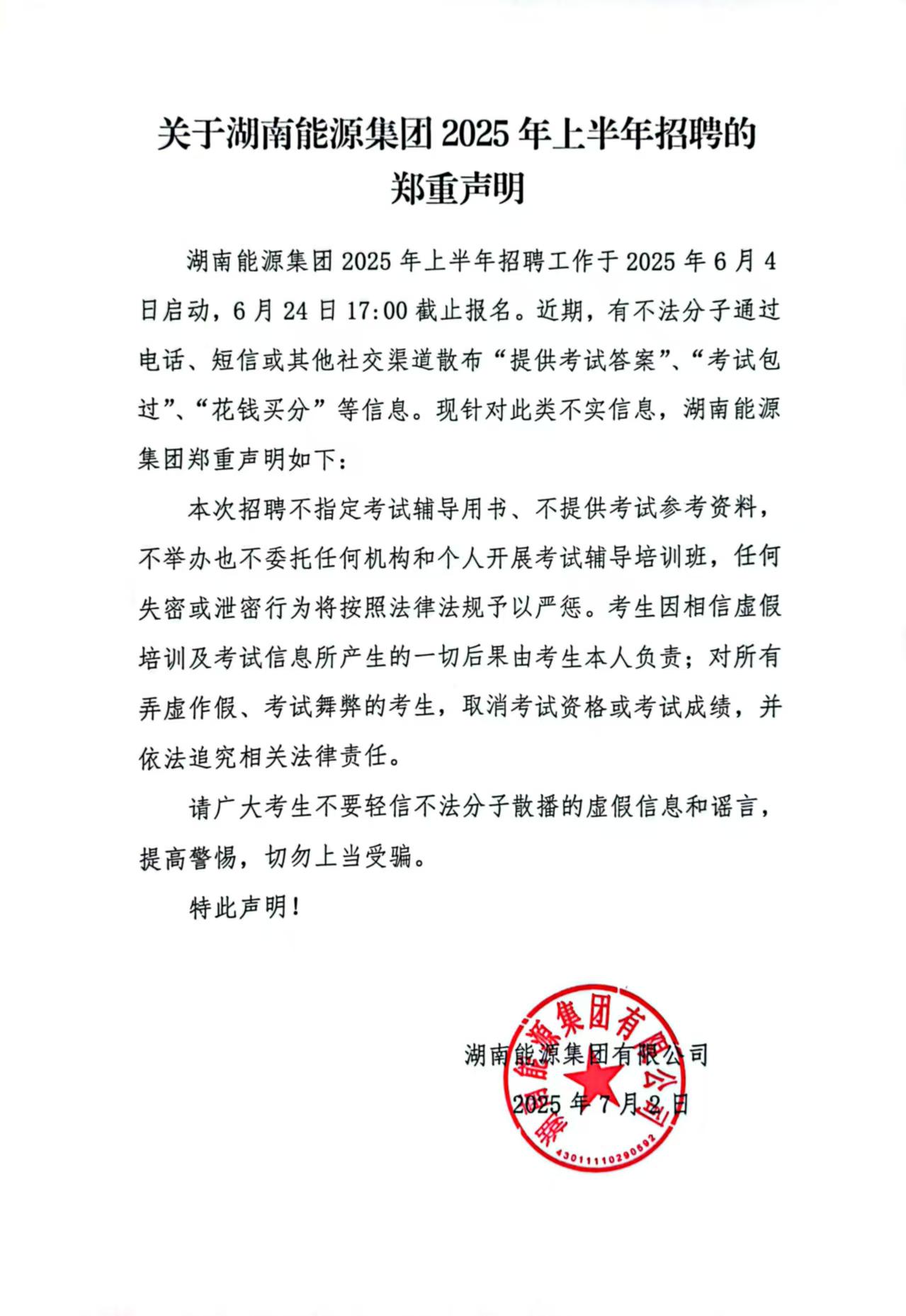 关于湖南能源集团2025年上半年招聘的郑重声明