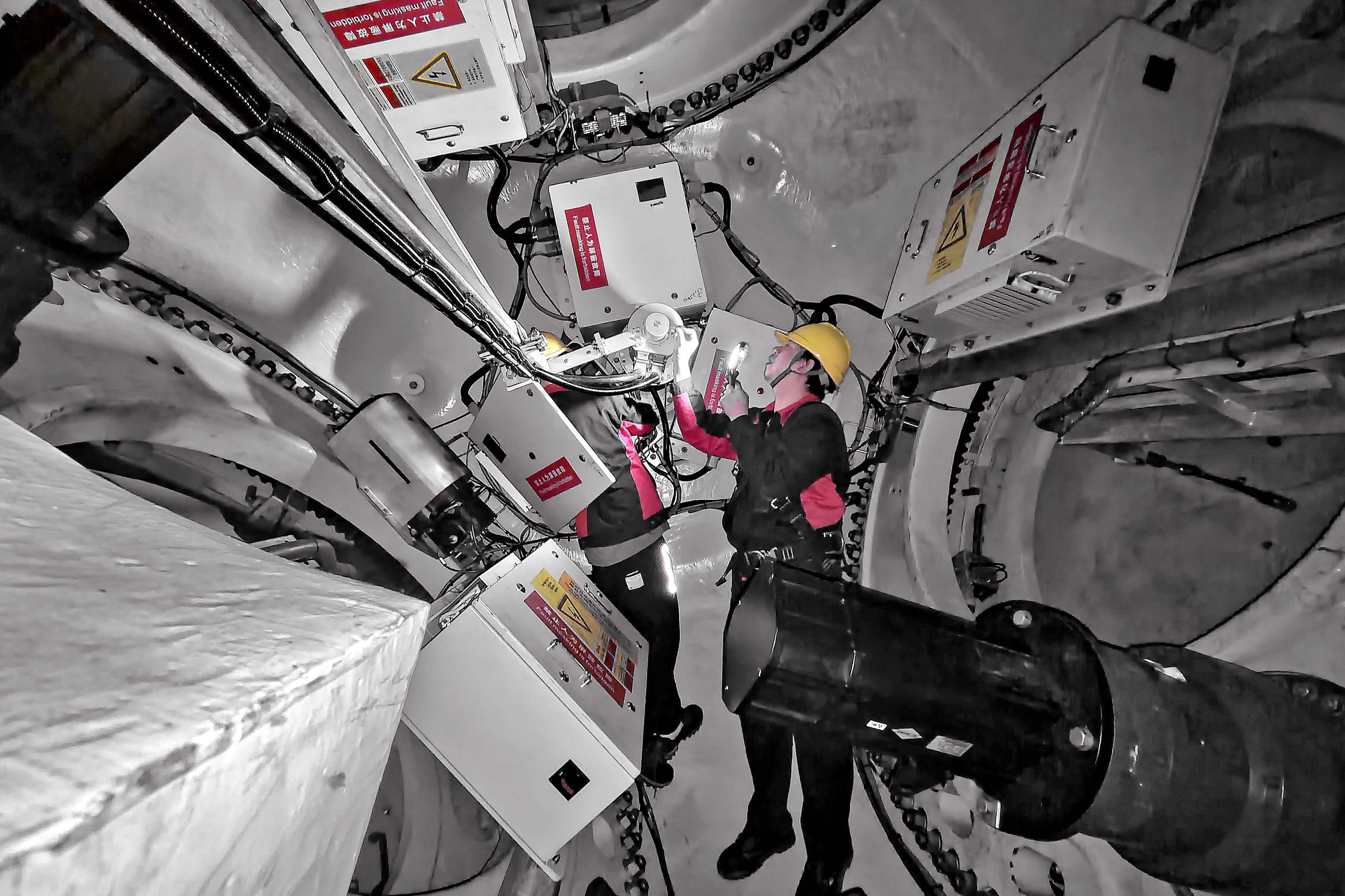湘投新能源湘乡褒忠山自运维风电场,维护人员在逼仄的风机内部进行高空作业,对风力发电机组高温部件及控制柜进行全面检查消缺